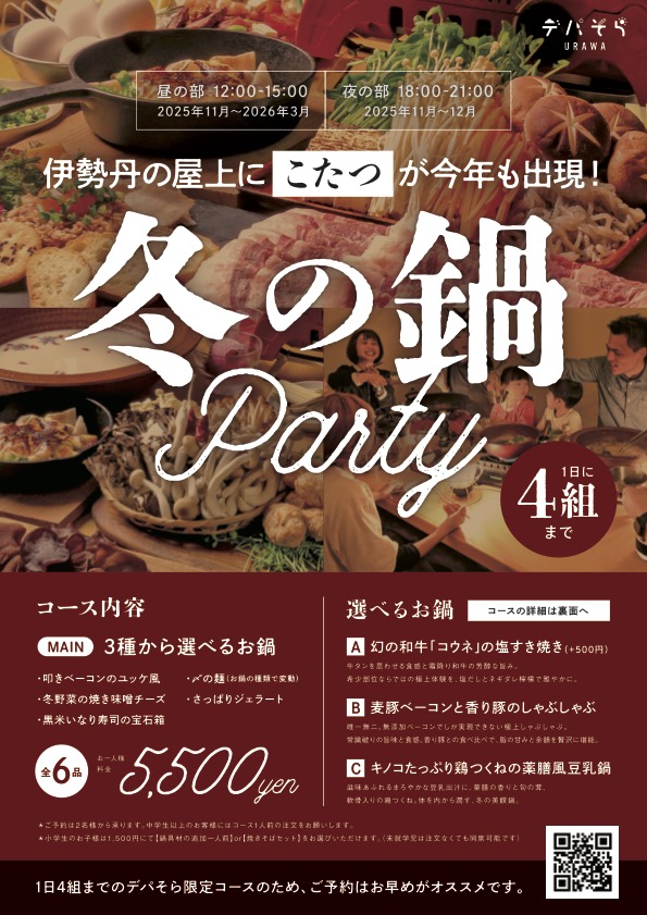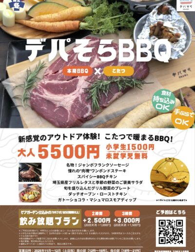 出店情報は以下のとおりです。 ★デパそらNEWS★** デパそら冬の宴会プラン『コタツ鍋&BBQパーティ』開催中!**➀『コタツ鍋&BBQパーティ』11月より土日祝で開催中!!冬ならではの特別なコタツ体験!手ぶらでBBQや鍋を楽しめる『コタツパーティ』開催!➁『デパそら青空パーティスペース(グランピング)』予約受付中!1時間単位でデパそらURAWAのパーティスペースをレンタルできます!ラグジュアリーな空間で、特別な記念日をお祝いしよう♪③『 URAWA ROOFTOP TERRACE(カフェ&バー) 』...